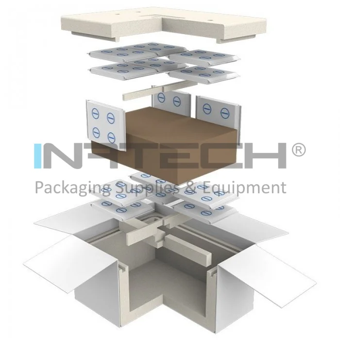 Sistemul este compus din: cutie carton exterior, cutie polistiren, cutie carton interna pentru produse si rezerve pentru racire PCM (material cu schimbare de faza) -21°C din spuma.