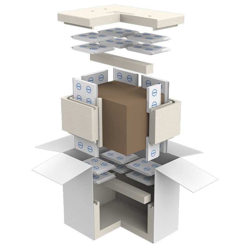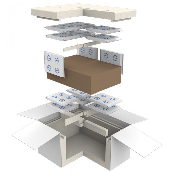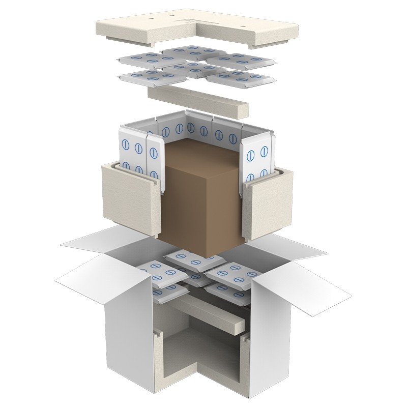 Sistemul este compus din: cutie carton exterior, cutie polistiren, cutie carton interna pentru produse si rezerve pentru racire PCM (material cu schimbare de faza) -21°C din spuma.