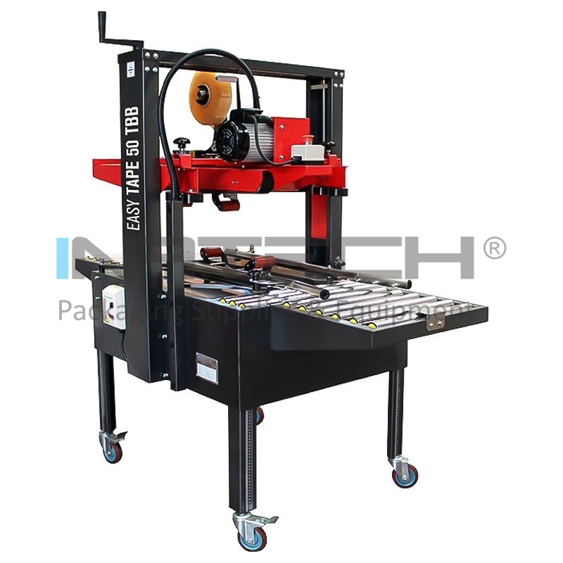 Машина за запечатване на кутии Easy Tape, скорост на запечатване 20 м/мин, тип лента BOPP / PVC / Kraft, тегло 250 кг, захранване 220 V - 50/60 Hz, максимален размер на кутия (мм) 500 x 500 мм