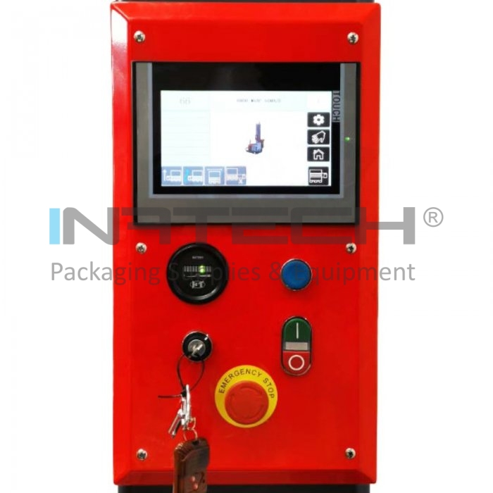 Miscarea robotului de infasurare a paletilor are loc automat datorita celor 2 comenzi pozitionate pe carma de ghidare. Robotul este prevazut in partea din fata cu o bara de protectie de siguranta care permite oprirea imediata in caz de ciocnire cu un operator sau un obstacol.
