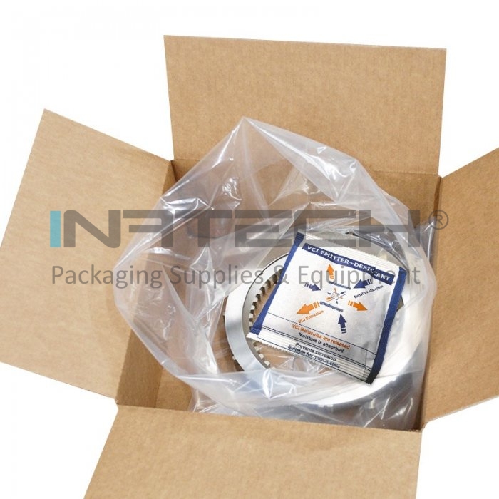 Sac VCI Desicant proiectat pentru a realiza o actiune dubla: VCI (inhibitor vulnerabil de coroziune), VCI (inhibitor activ de coroziune), pentru a asigura o protectie rapida impotriva procesului de coroziune si a procesului de uscare pentru a absorbi umezeala.